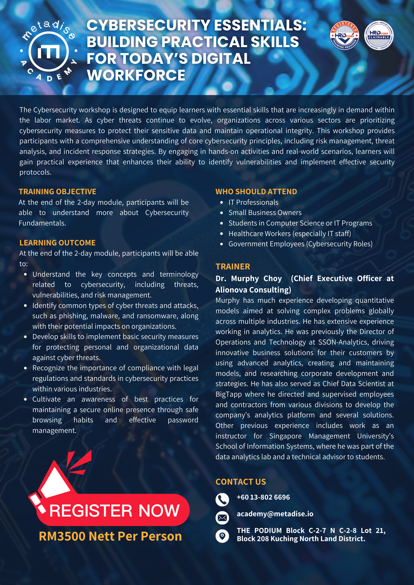 At the end of the 2-day module, participants will be able to understand more about Cybersecurity Essentials to Build Practical Skills for Today’s Digital Workforce.