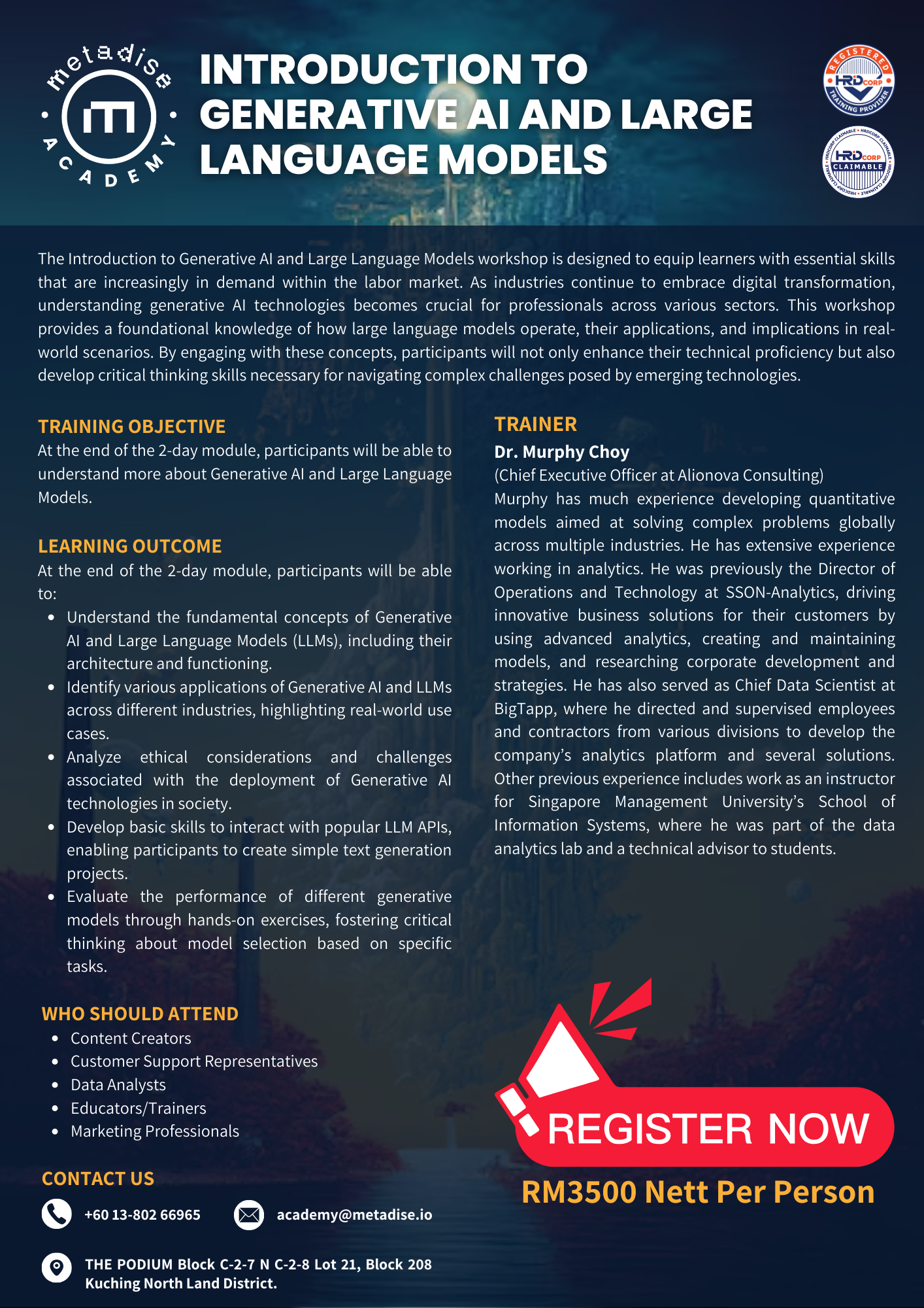 At the end of the 2-day module, participants will be able to understand more about Generative AI and Large Language Models.